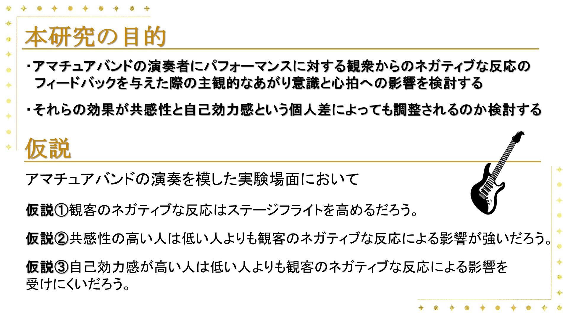 また長年、ステージ演奏を行う際のあがりを課題として感じていたことから、その改善に向けた手がかりとなるものを得たいと考え、本研究のテーマを決定しました。