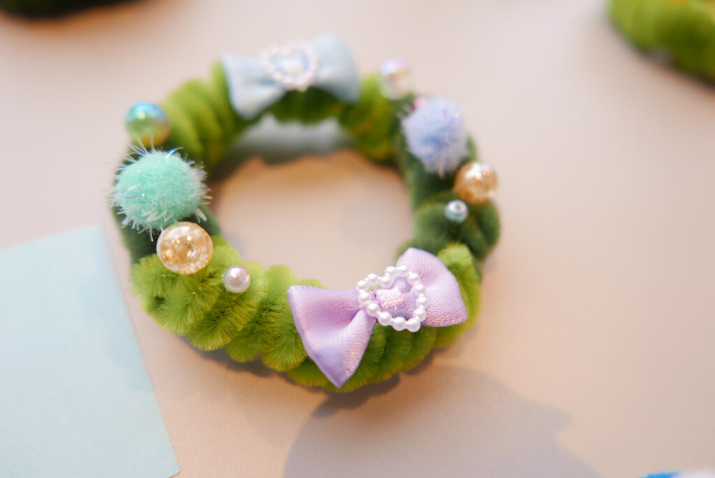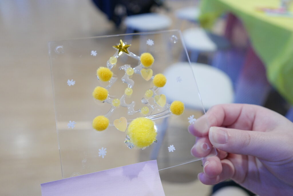 雪だるまは白い靴下、リースはモール、クリスマスツリーは透明のアクリル写真立てを使うなど、身近で手に入る材料に、ビースなどで装飾して作品を作りました。
