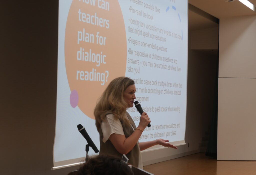 学生は、特に、新しい本を読むときには過去の本とのつながりを考えることや子どもの興味や関心に応じて週または月に何度も同じ本を読み返すことが重要だというお話を、うなずきながら聞いていました。より子どもたちの創造力に影響を与える対話型読書とはどのようなものか考えるきっかけになったようでした。