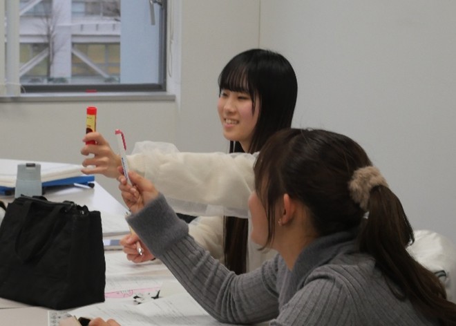第13回の授業では、小グループに分かれて手作りの教材を用いた部分実習を行いました。