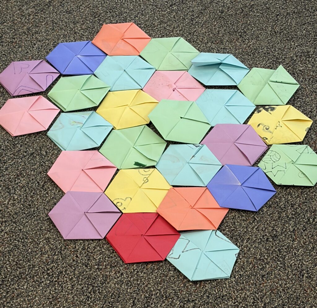 自己紹介を紙に書き、その紙を六角形に折ってみんなで並べました。