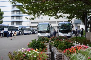 今日は3年生の林間学寮出発日とも重なっていたので、世田谷キャンパスには13台もバスが集結しました。
